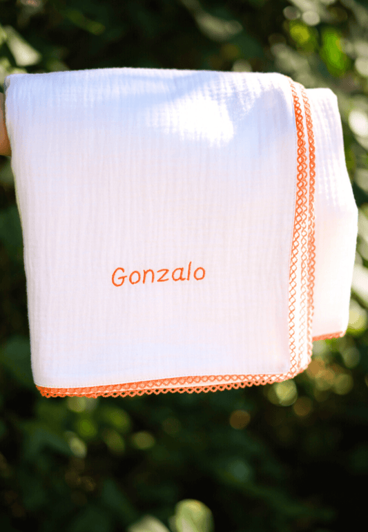 Manta para bebé personalizada (Verano y entretiempo) con puntillita naranja
