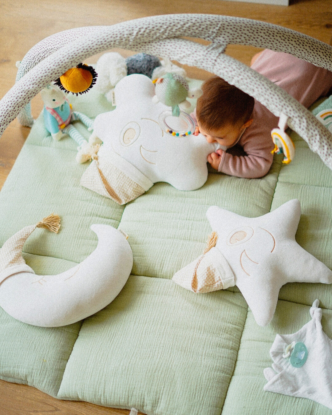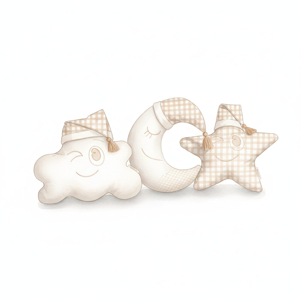 Con formas de nube, estrella y luna, bordado manual y tacto aterciopelado, hechos en nuestro atelier en España.