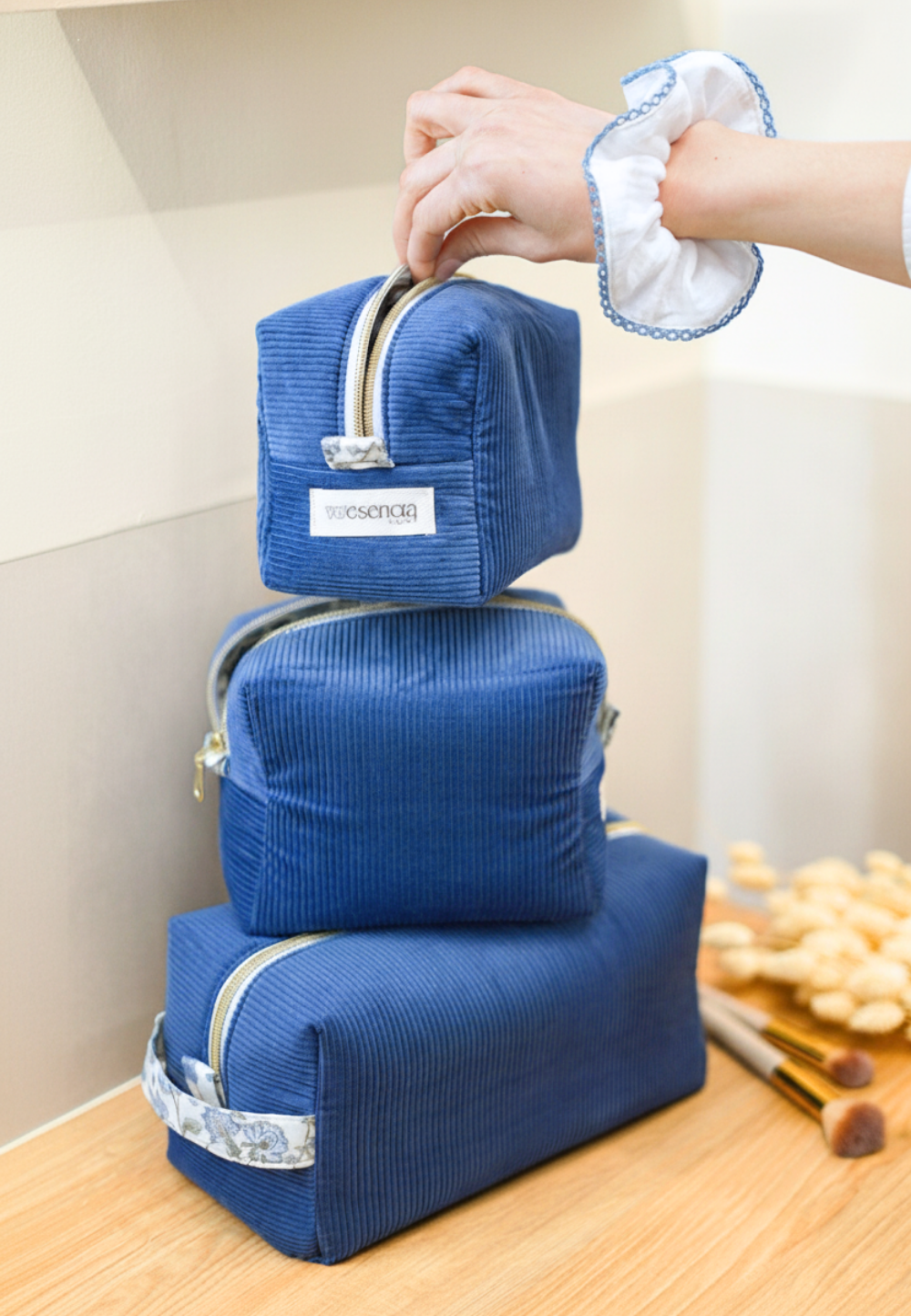 Diseño único y atemporal de neceseres de viaje. Todo a juego con una colección azul de pana increíble.