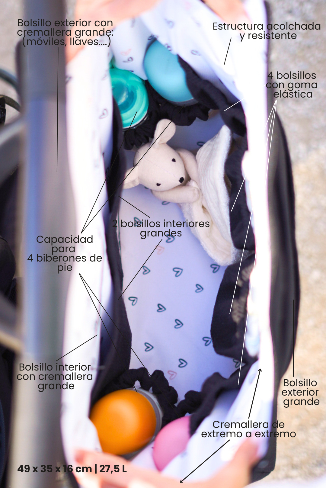 - 4 Bolsillos interiores para ordenar accesorios, pañales, etc, 1 bolsillo largo con velcro, 1 bolsillo interior con cremallera, 4 elásticos para mantener 4 biberones de pie, y 2 bolsillos exteriores: uno grande frontal con botón a presión, y otro bolsillo por la parte trasera con cremallera, muy utilizado para tener siempre a mano móvil y llaves.
