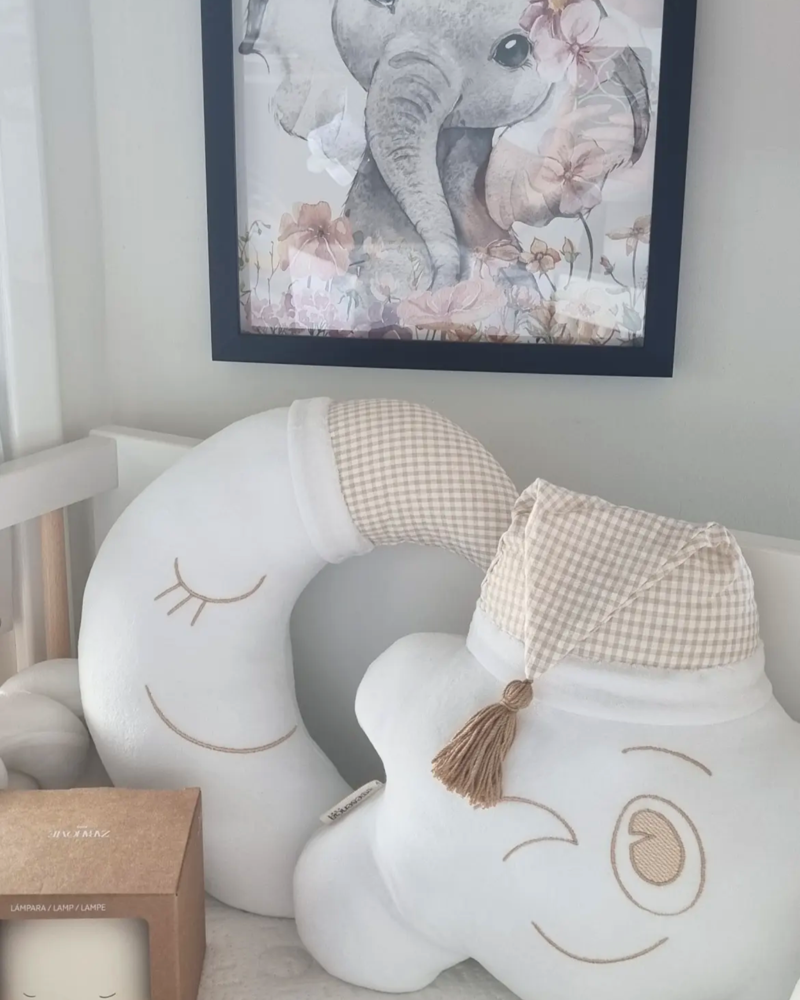 Cojín de terciopelo blanco con forma de luna y bordado con carita dulce que duerme plácidamente con hilo dorado.