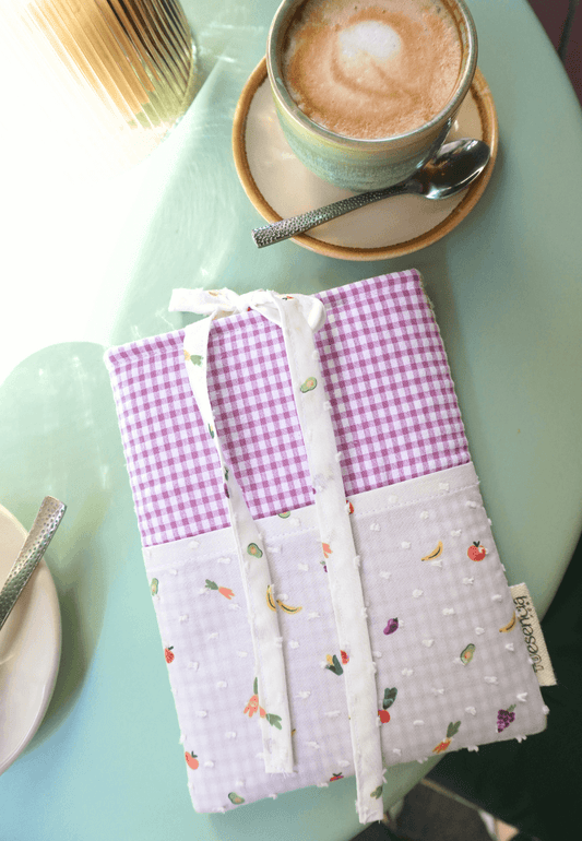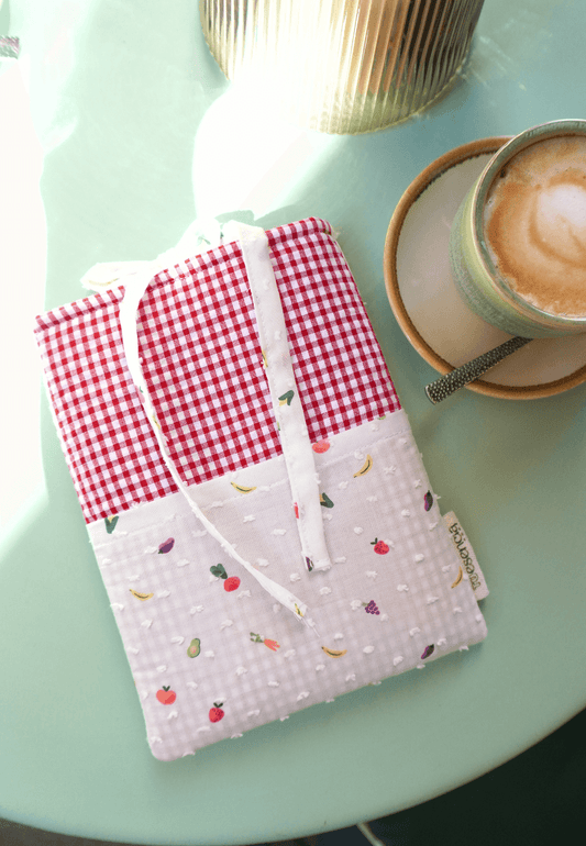 Funda de ebook hecha a mano con cerezas rojas y detalle de cierre con lacitos.
