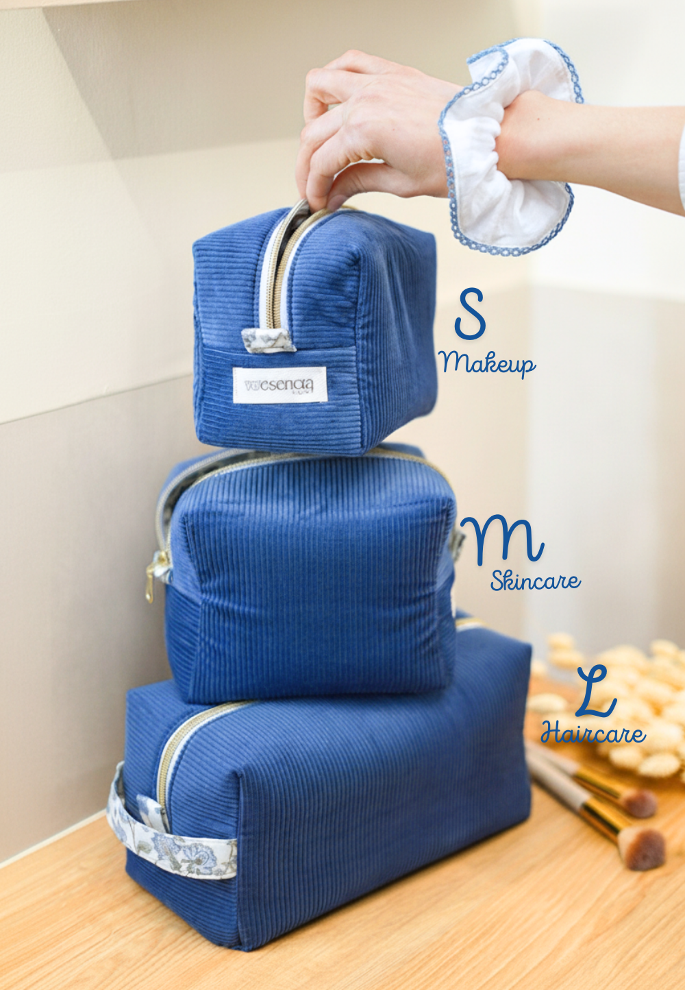 Diseño único y atemporal de neceseres de viaje. Todo a juego con una colección azul de pana increíble.